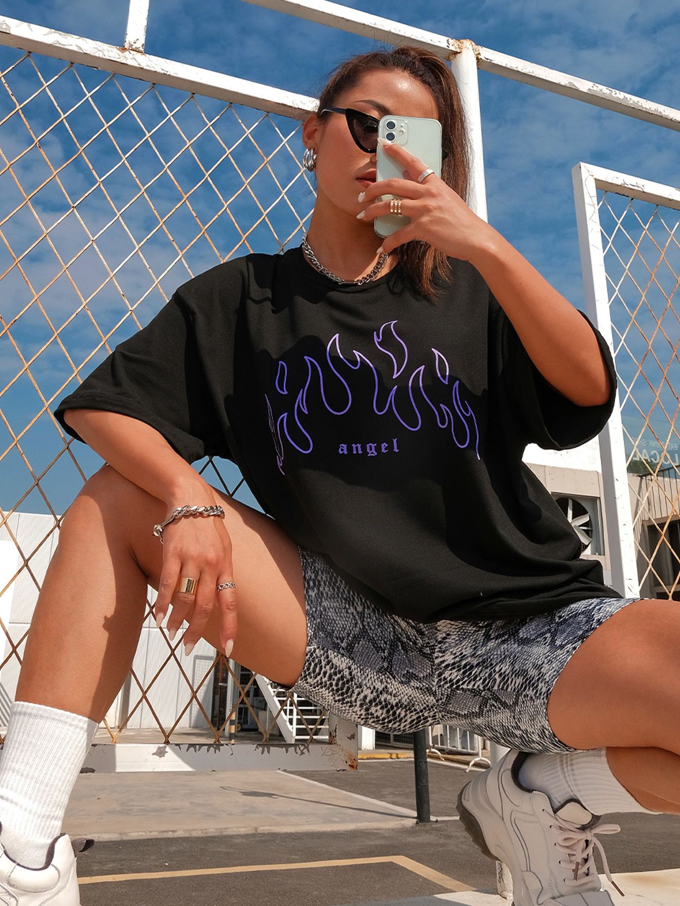 تيشيرت أسود فضفاض بأكمام قصيرة مزين بطبعة لهب بنفسجية وكلمة "angel"